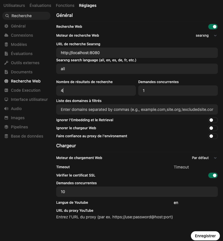 Toujours dans le panneau d’administration, et dans la section réglage, on va activer la recherche web, et donner les paramètres de recherche.