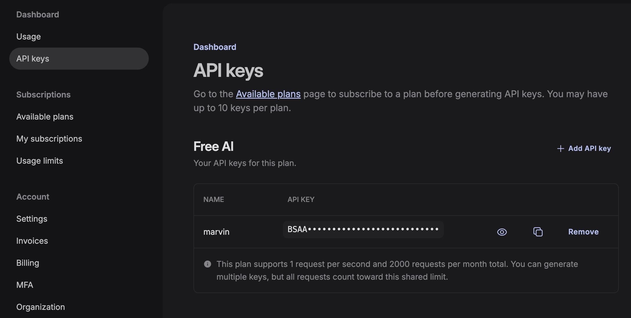 On se rend sur le dashboard, et on demande une clé pour la recherche IA