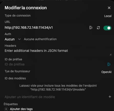 Pour un serveur vLLM local j’ai ce réglage là, mais évidement vous devez le personnaliser. Il existe l’option Ollama également, comme ça, il y a le choix !