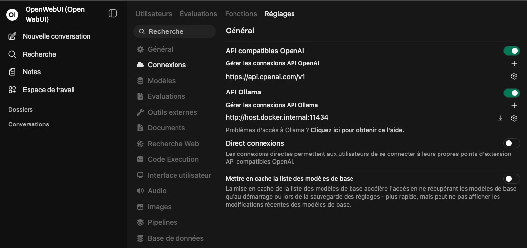 Open WebUI permet d’utiliser le moteur IA de notre choix. Je vais donner ici l’exemple d’un serveur local compatible OpenAI, mais ça peut être celui que vous voulez.
