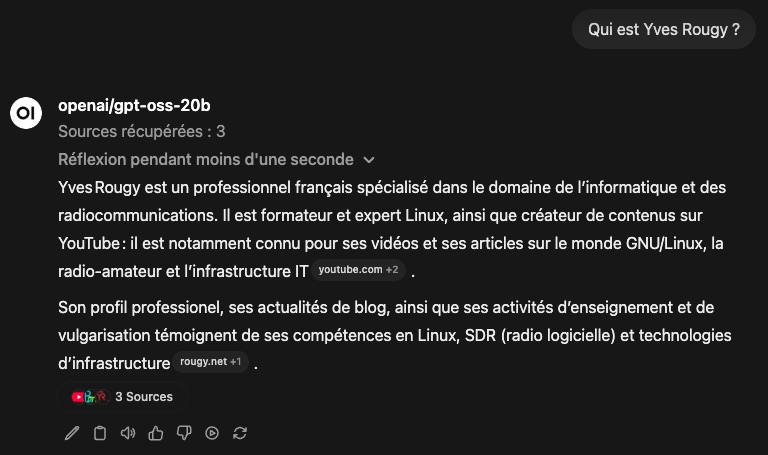 La recherche, parlons-en ! Certains modèles (mais pas tous) peuvent appeler des agents. C’est à dire que en fonction de l’analyse de la question de l’utilisateur, il va pouvoir “faire appel à un ami”, c’est à dire appeler un outil/agent pour lui donner des informations complémentaires. On en trouve pour des calculs, par exemple, et bien entendu, avec Open WebUI, l’analyse de la question par le modèle, comme GPT-OSS:20b, peut se dire “hum, ça serait bien que je fasse une recherche web !”.